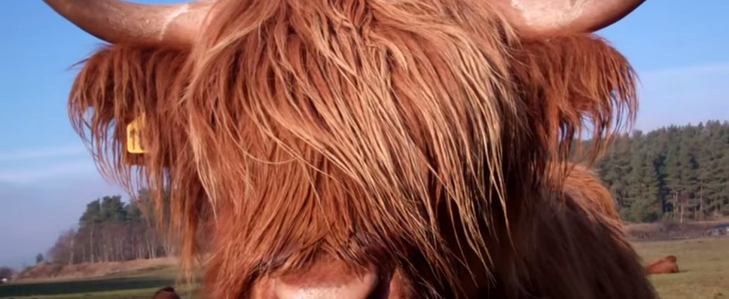 Tour Scotland close up video shot of a Highland Cow in a field just North of Glamis Castle, Angus, Scotland. Highland cattle or kyloe are a Scottish breed of beef cattle with long horns and long wavy coats which are coloured black, brindled, red, or yellow.